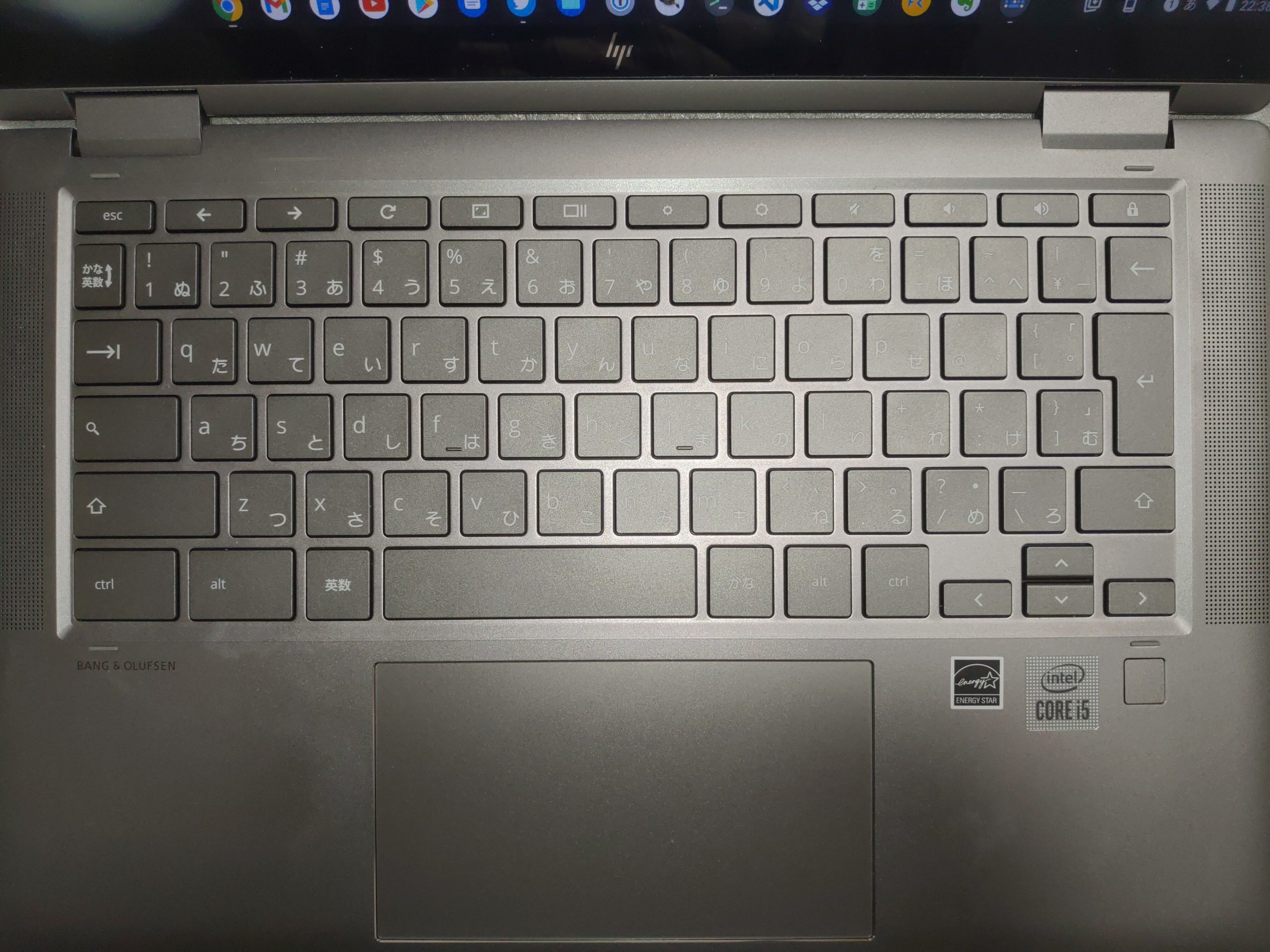 x360 14cのキーボード(日本語)です。Win/Macとだいたい一緒なんですけれど、上段のキーが全然違います。