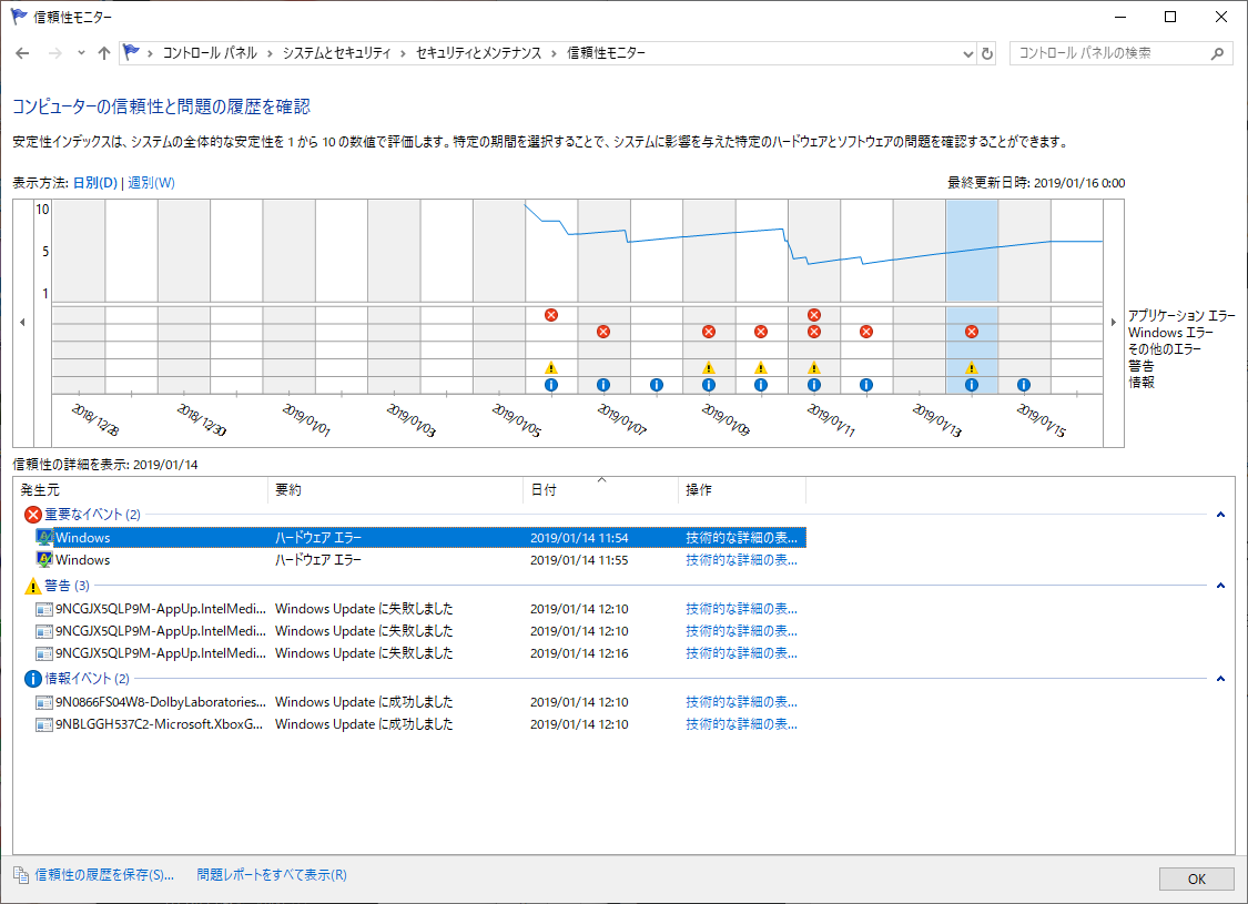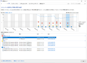 いろいろ見ていると、OSがクラッシュしたタイミングなどを確認できる「信頼性履歴の表示」を知りました。