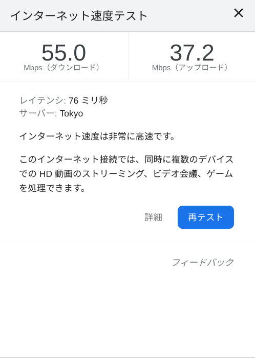 外向きの回線速度は外向きの口が重要ということで…うちの回線だとWi-Fi6も宝の持ち腐れ… (改めて確認したところ、うちの契約「フレッツ光 マンションタイプ」だったので、100Mbpsでした…だから回線的にな上等なスループットともいえる…こればかりは建物の問題なので仕方ないけど、今の時代きついかも…)